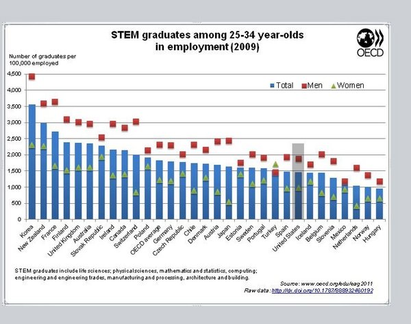 The Organization for Economic Cooperation and Development report on STEM graduates worldwide paints the dismal portrait above of American achievement in which we rank behind 22 other counties in the production of technically trained college graduates.